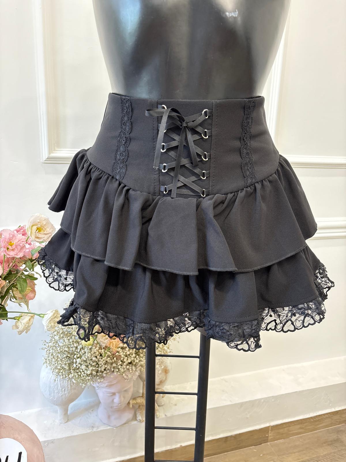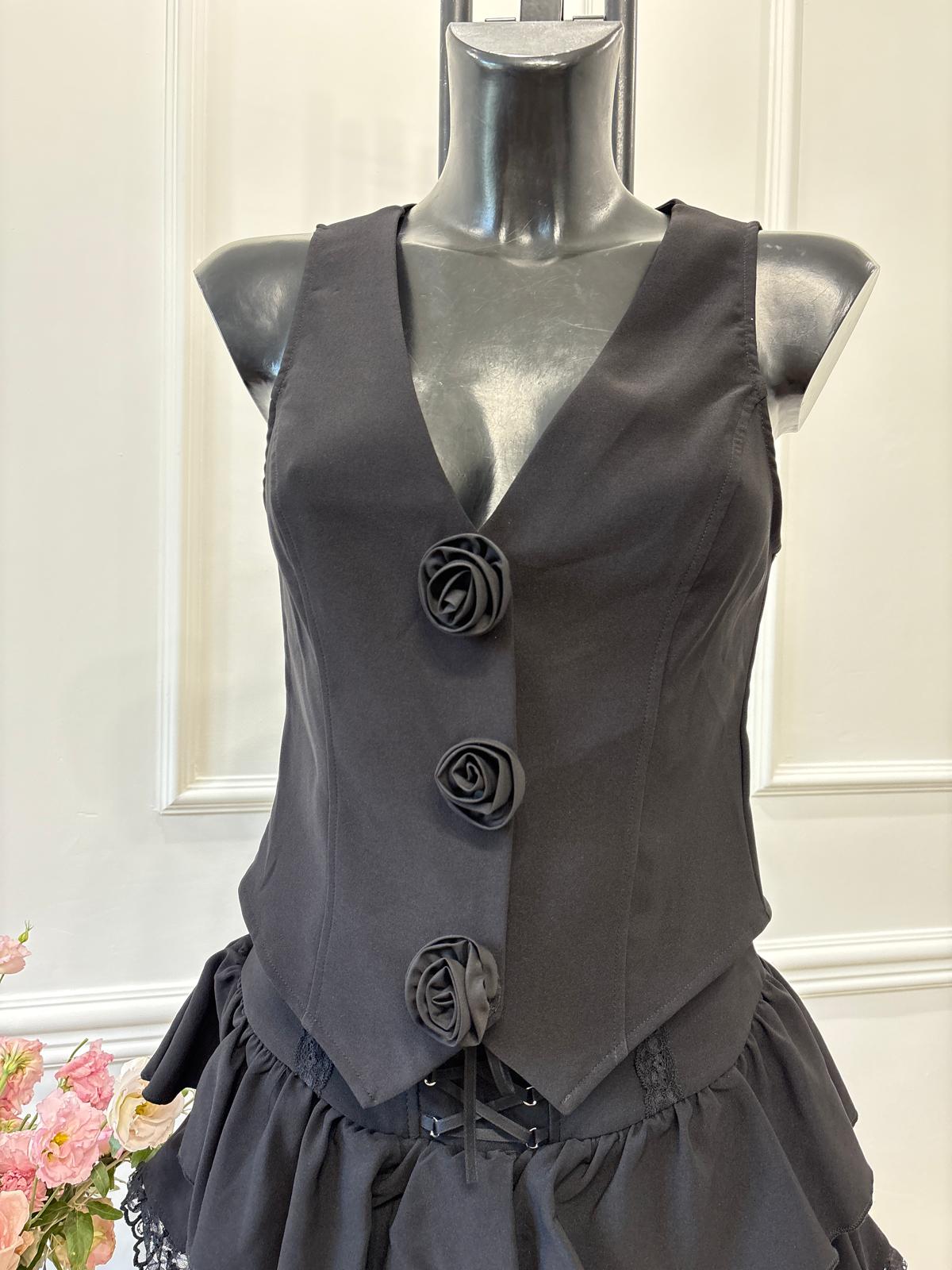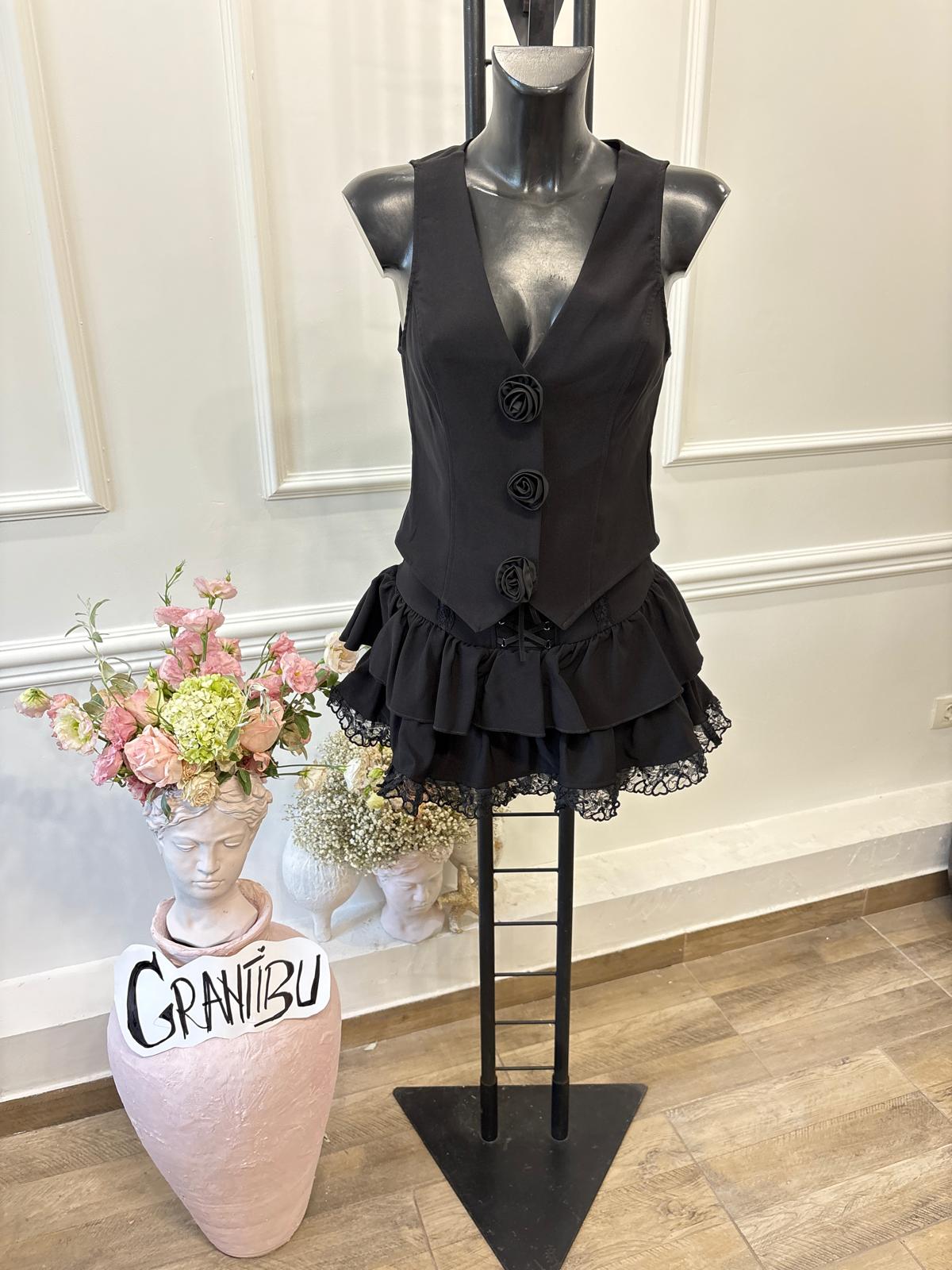 Setul este compus din vestă și fustă din material Barbie fin, cu detalii din dantelă și trandafiri aplicați care adaugă un aer ușor teatral și extravagant. Fusta este prevăzută cu chilotel interior pentru un plus de confort, iar ansamblul te duce subtil cu gândul la estetica burlescă, fiind o alegere îndrăzneață și plină de personalitate.